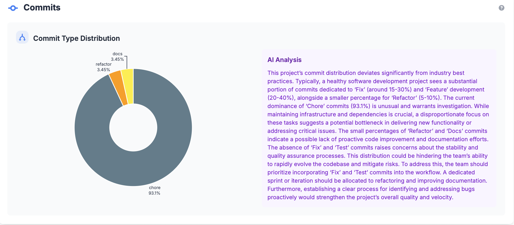 Unlike repository-level analysis that focuses on ratios, GitPulse's project-level commit classification provides AI-powered insights that compare your project's development patterns against industry standards and best practices.